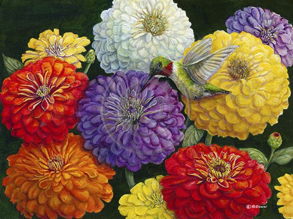 "Zinnias and Hummer" - Ruby throated hummingbird